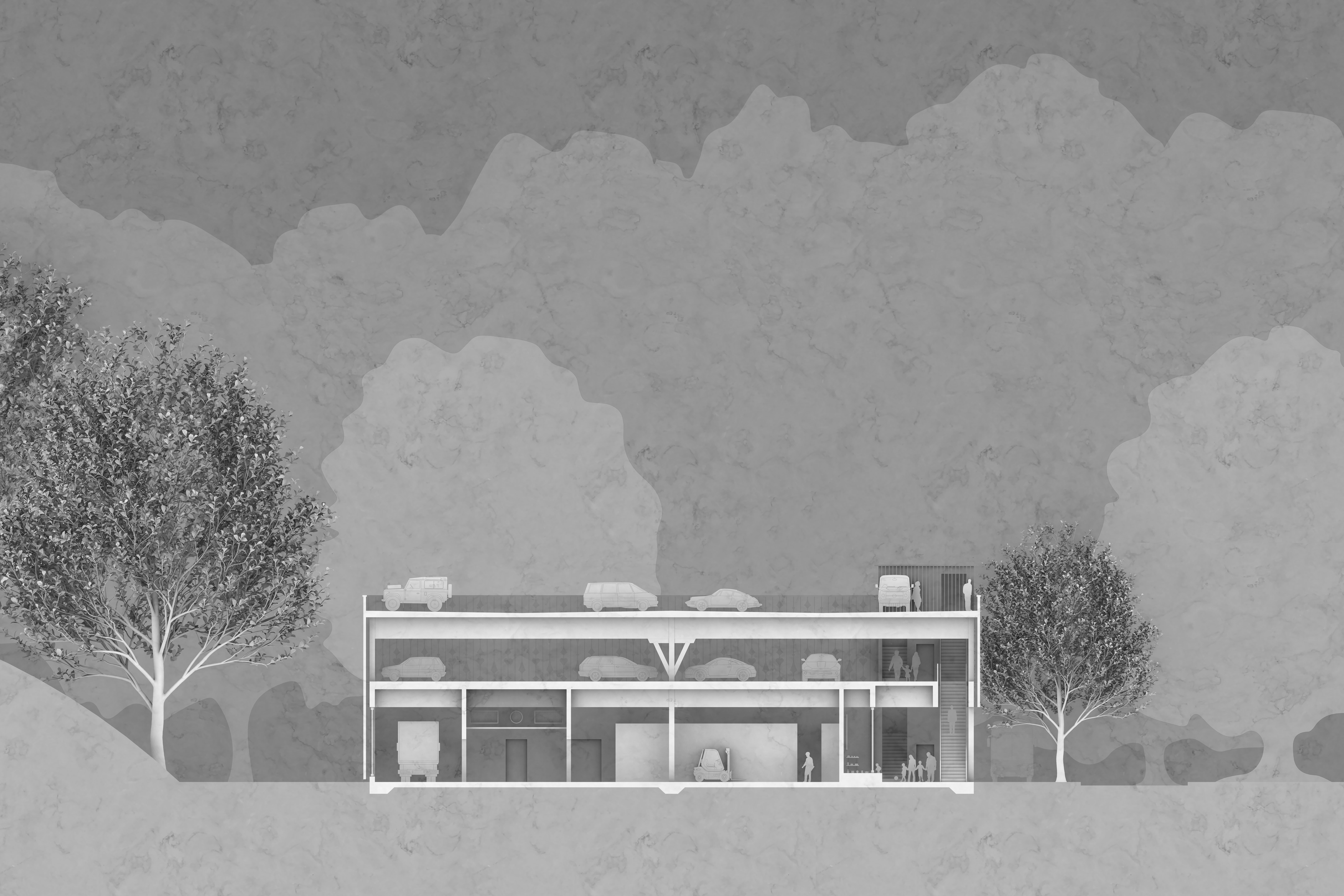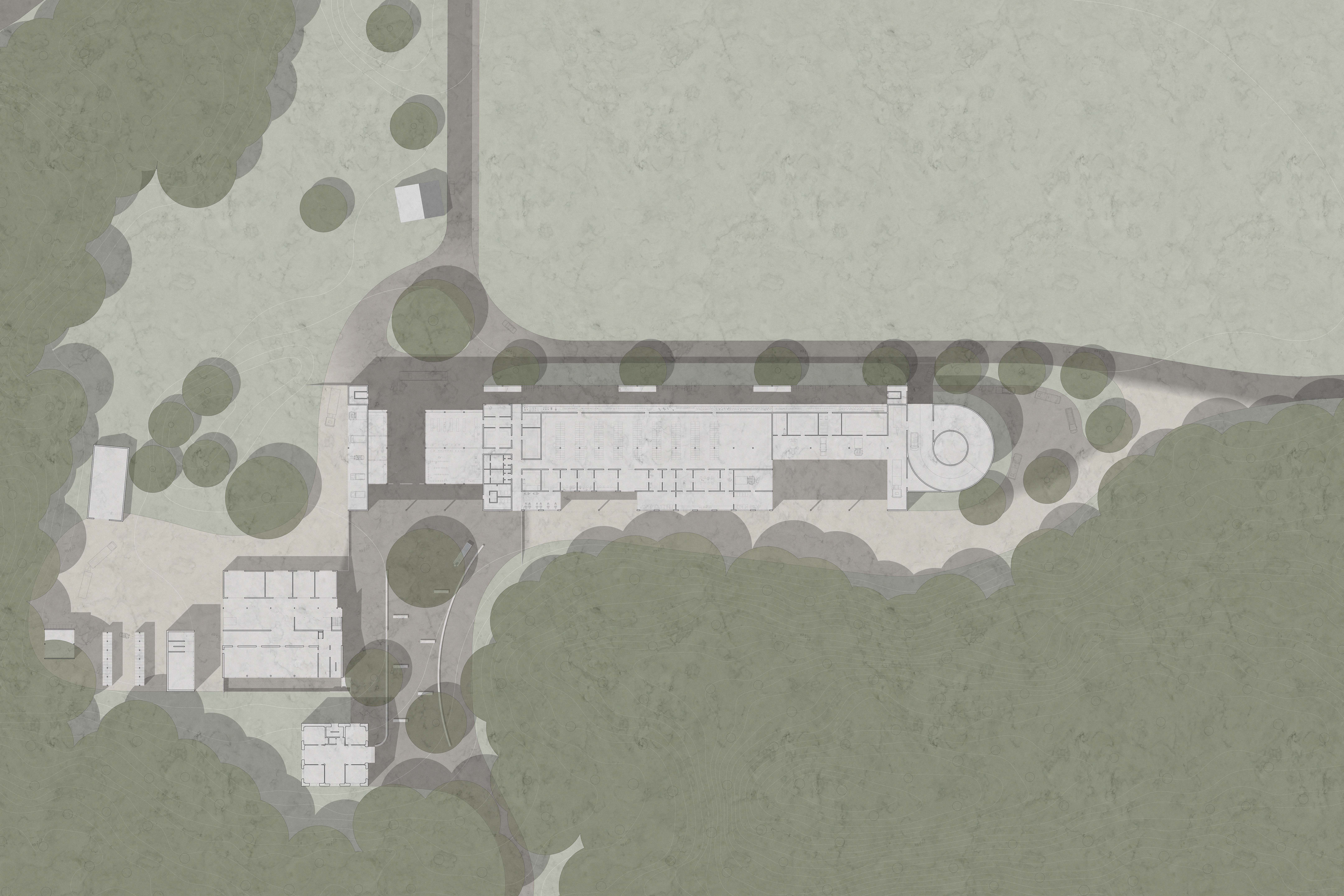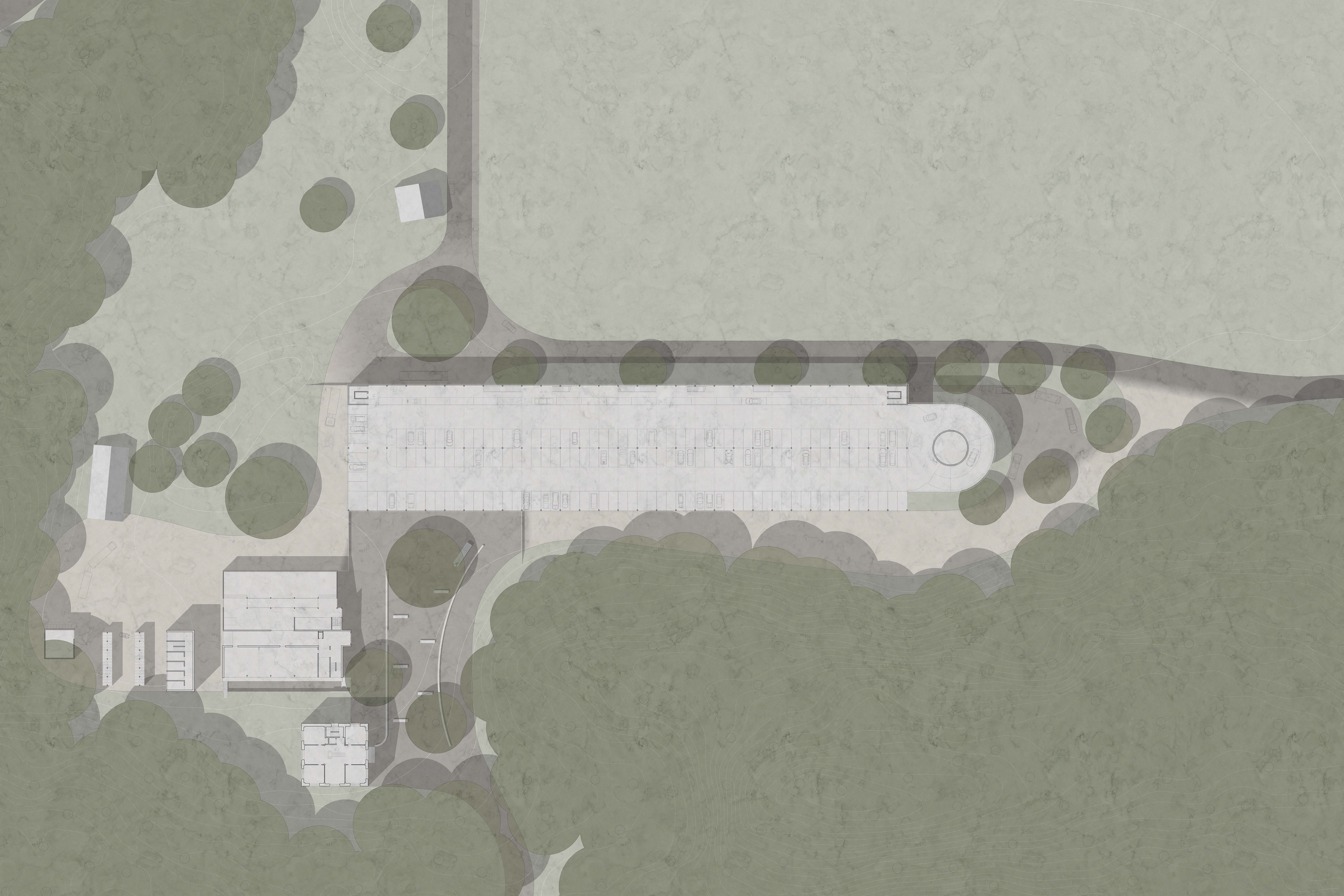 Das Freilichtmuseum Ballenberg benötigt ein neues Gesamtkonzept für seinen Haupteingang. Dieser soll sich als repräsentatives Element in die Landschaft integrieren und mit neuen Depoträumen, Werkhofflächen und einem Parkhaus ergänzt werden. Der erarbeitete Vorschlag vereint all diese Anforderungen in einem Objekt, das sich entlang des Waldrandes positioniert. Nordseitig entsteht ein gedeckter Ankunftsort, der den öffentlichen Verkehr und die höhergelegenen Parkdecks über ein Showlager erschliesst. Südseitig setzt das Objekt einen Grundakkord auf dem neuen Museumsplatz, der als gestalteter Freiraum mit den bestehenden Gebäuden zu einem musealen Gesamtensemble verwoben werden soll.