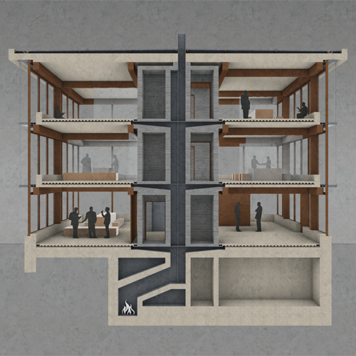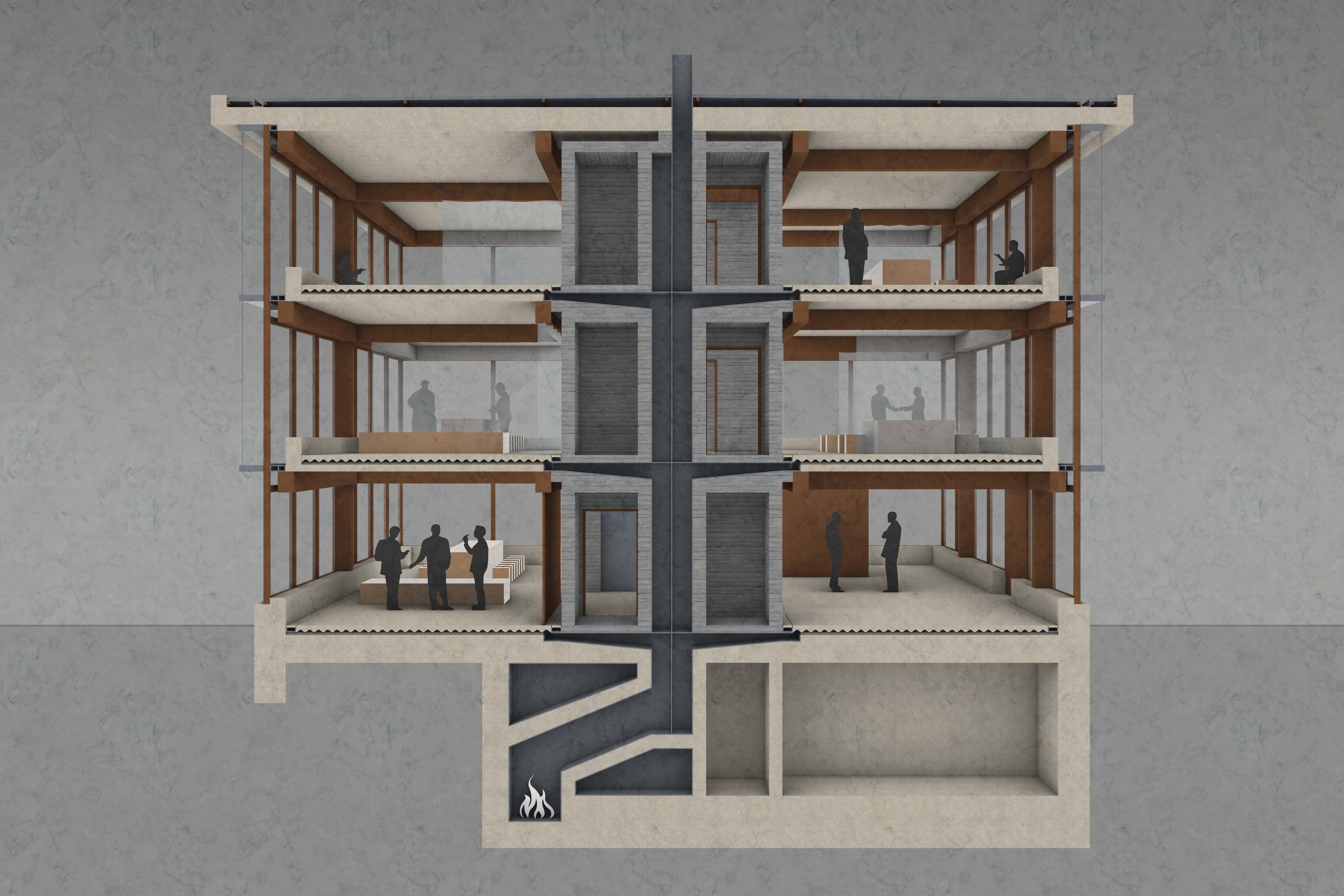 Im Zuge der regionalen Weiterentwicklung möchte die Gemeinde Meiringen zusätzliche Gewerbestandorte schaffen. Dafür stellt sie in der Kreuzgasse eine Parzelle zur Verfügung. Das entstandene Objekt steht für den Wiedereinzug des Holzbaus, der wegen den Jahrhundertbränden sukzessiv aus dem Dorfgefüge verbannt wurde. Inspiriert von der historischen Reminiszenz des Ortes, schafft das Objekt eine Kohärenz zwischen einer experimentellen Form des Hypokaustums und einer reziproken Tragstruktur.