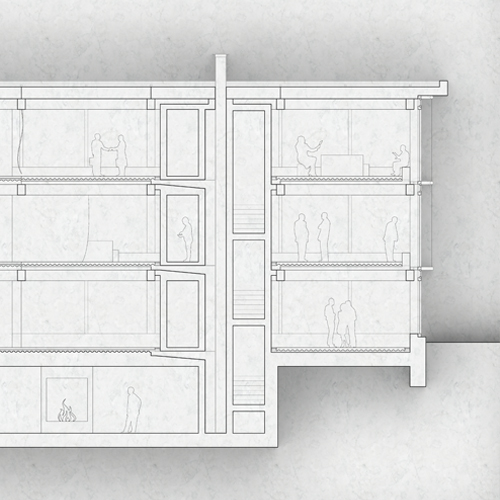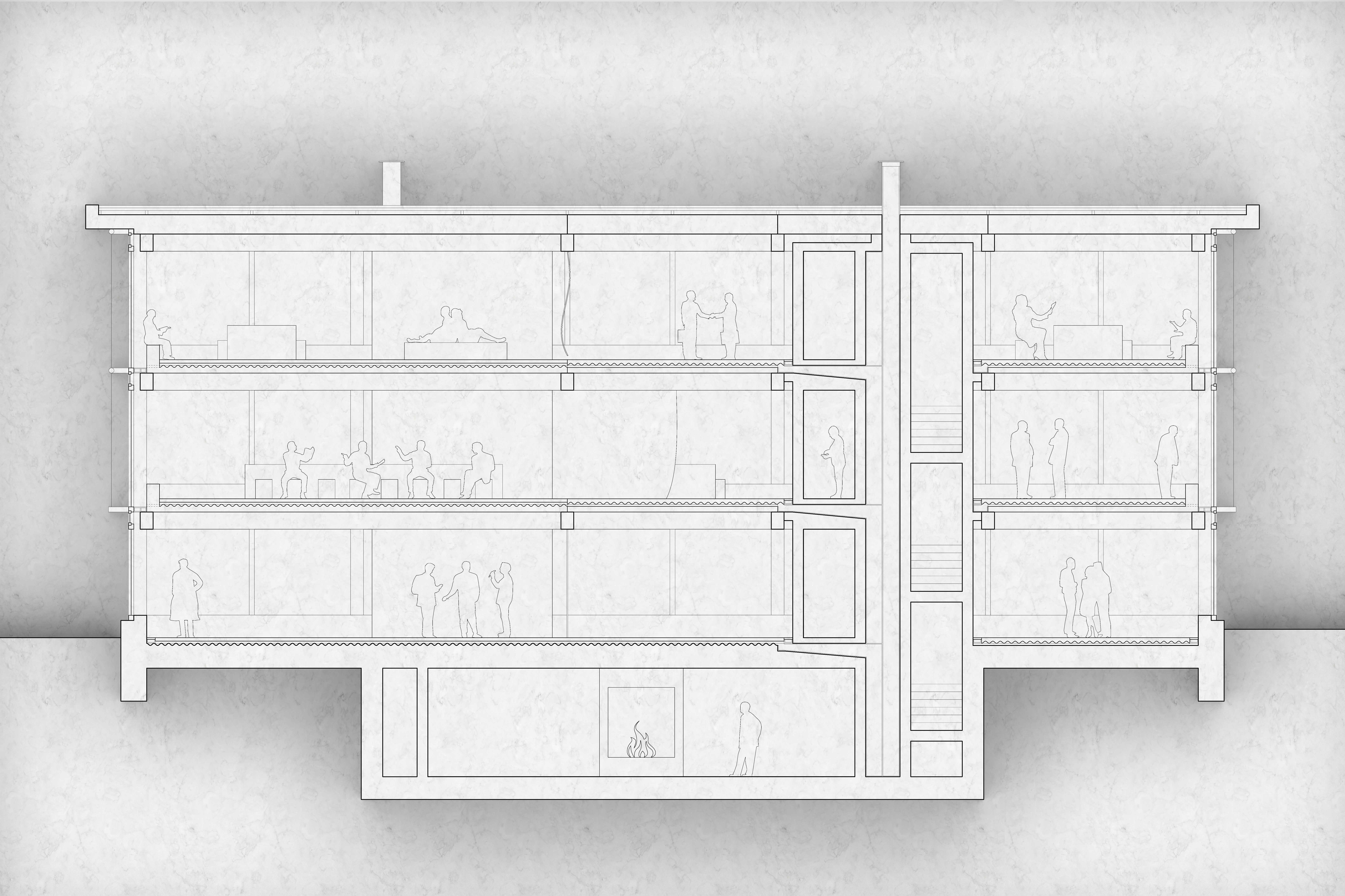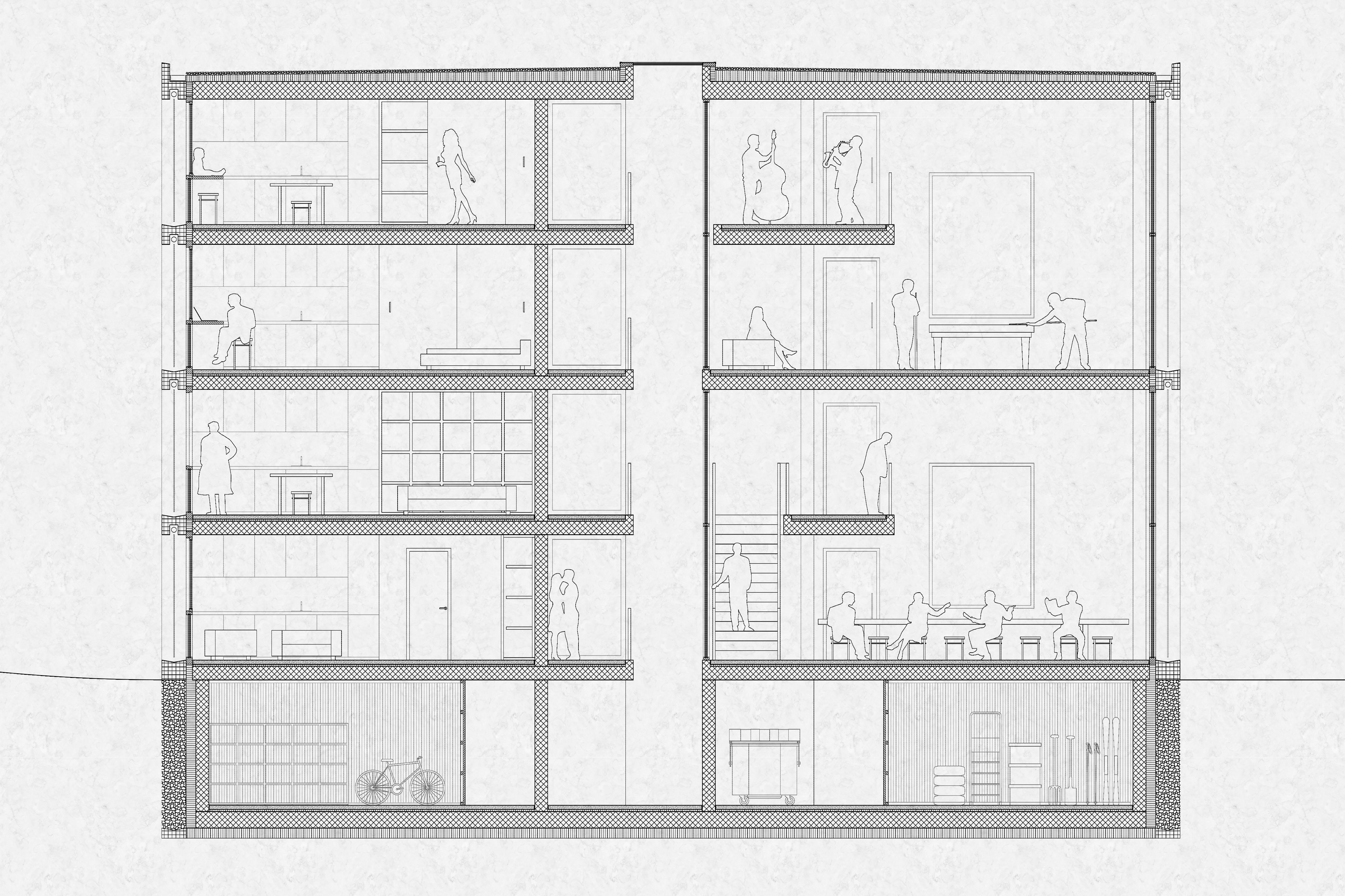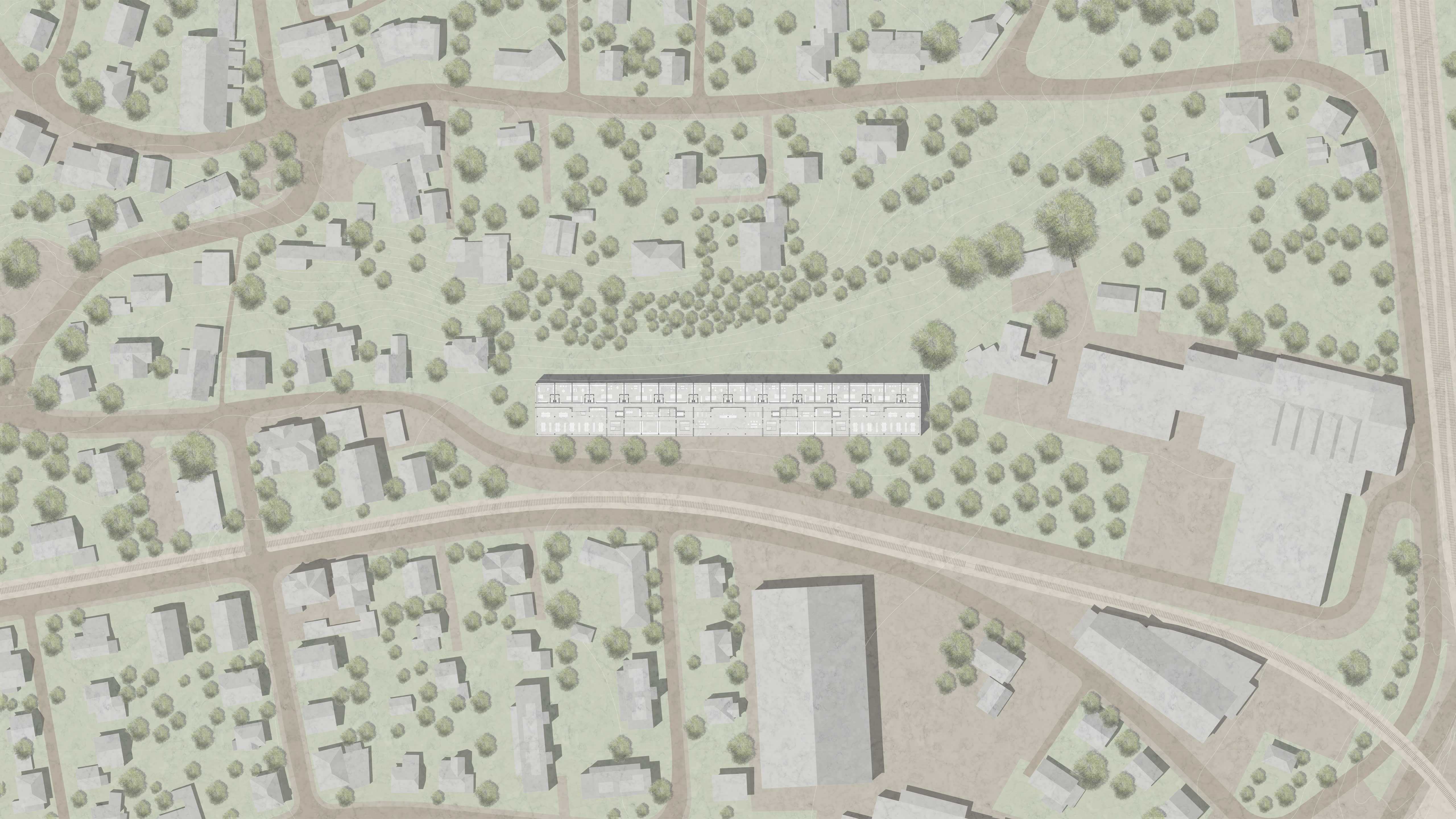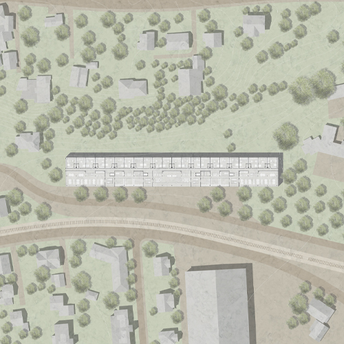 Die Agglomeration Langenthal möchte neuartige Wohnformen anbieten. Hierfür stellt sie in Bahnhofsnähe ein Grundstück zur Verfügung, das westseitig von einem Hang und ostseitig durch die Verkehrsinfrastruktur begrenzt wird. Um deren Lärmemissionen gezielt konterkarieren zu können, richtet sich das Objekt entlang der topografischen Gegebenheiten aus. Dadurch entsteht auf der Hangseite eine ruhige Wohnlage und gegen die Strassenseite eine prominente Adressierung. An dieser siedeln sich diverse Gemeinschafts- und Geschäftsräume an, die von allen Hausbewohnern gleichermassen genutzt werden dürfen. Die individuellen Wohneinheiten werden zugunsten des kollektiven Raumes auf das Minimum reduziert.
