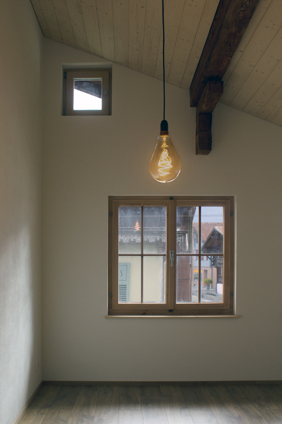 Das Elternhaus in Matten bei Interlaken ist ein heterogenes Gebilde, das sich aus wiederholten Umbauprozessen zusammensetzt. Das zur Metzgerei umfunktionierte Blockhaus entspricht nur partiell den aktuellen Wohnbedürfnissen. Besonders unbehaglich sind die abgenutzten Räume, deren Raumhöhe durch den Dachstuhl begrenzt werden. Im Zuge einer Intervention wurde dieser Abgetragen und die daraus resultierenden Räume mit neuen Raumverkleidungen ausgestattet.